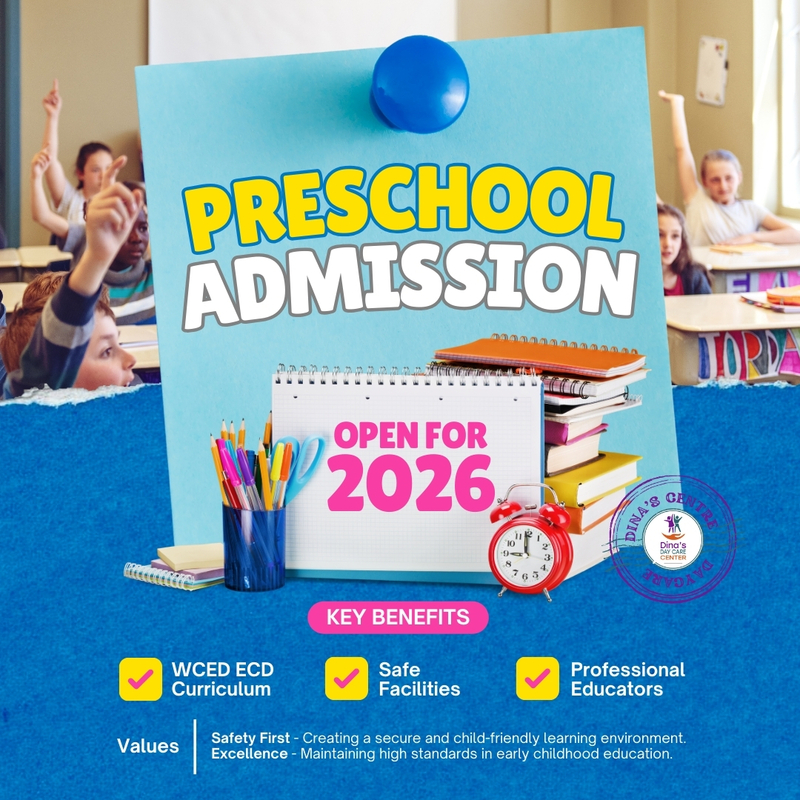 Dina’s Day Care operates Monday to Friday, offering a safe and caring environment for children throughout the day. For specific drop-off, collection times, or after-care enquiries, please contact us via WhatsApp.