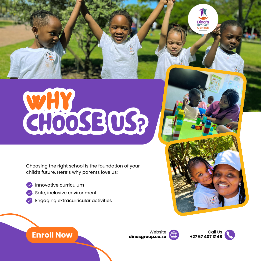 As a subsidiary of Dina’s Group of Companies, a South African-registered, woman-owned business, we take pride in providing high-quality education and care for children aged 3 months to 5 years. Our curriculum is designed to foster creativity, confidence, independence, and social development, ensuring that every child receives a strong foundation for lifelong learning.